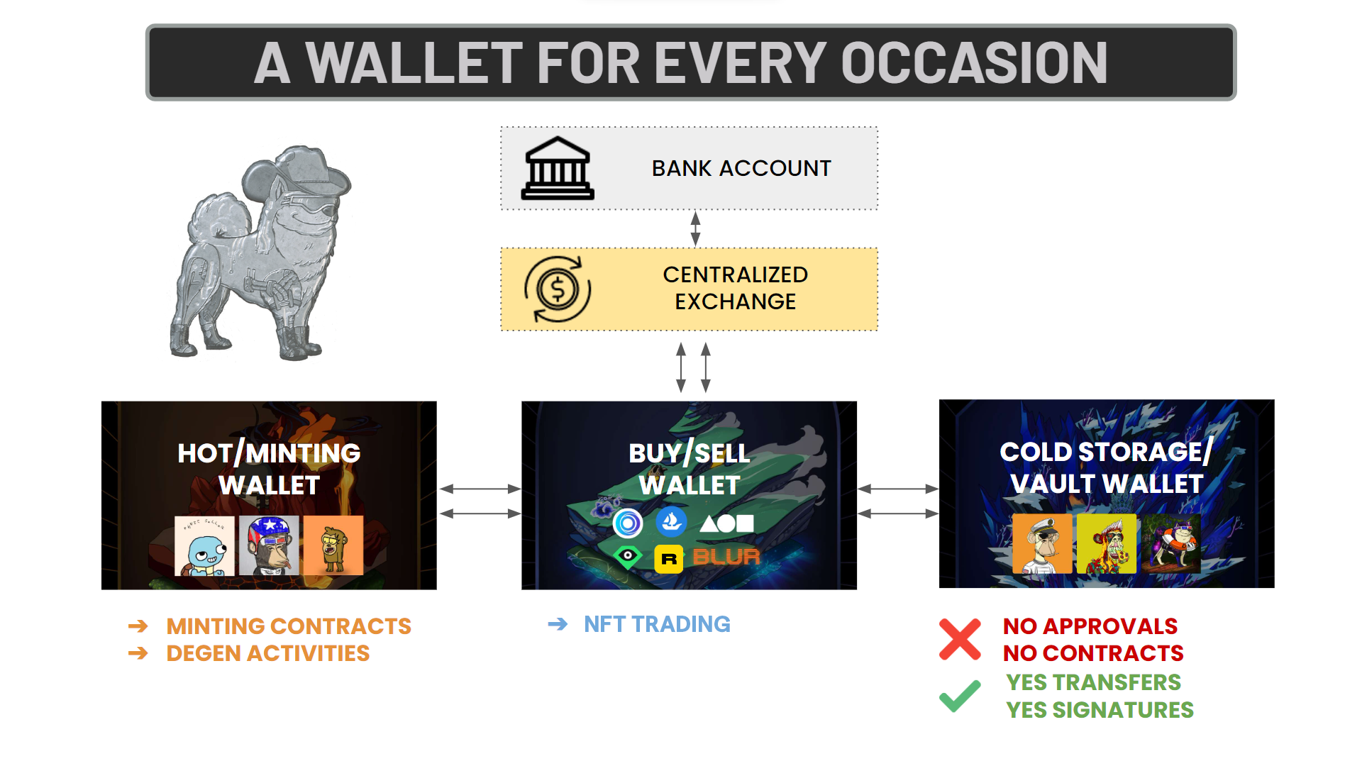 Using different wallets for different occasions (i..e having a mint wallet, a vault wallet etc. â weâll get into that later) and understanding of approvals and signatures should provide a solid foundation that will allow you to be better off than 95% of the space.