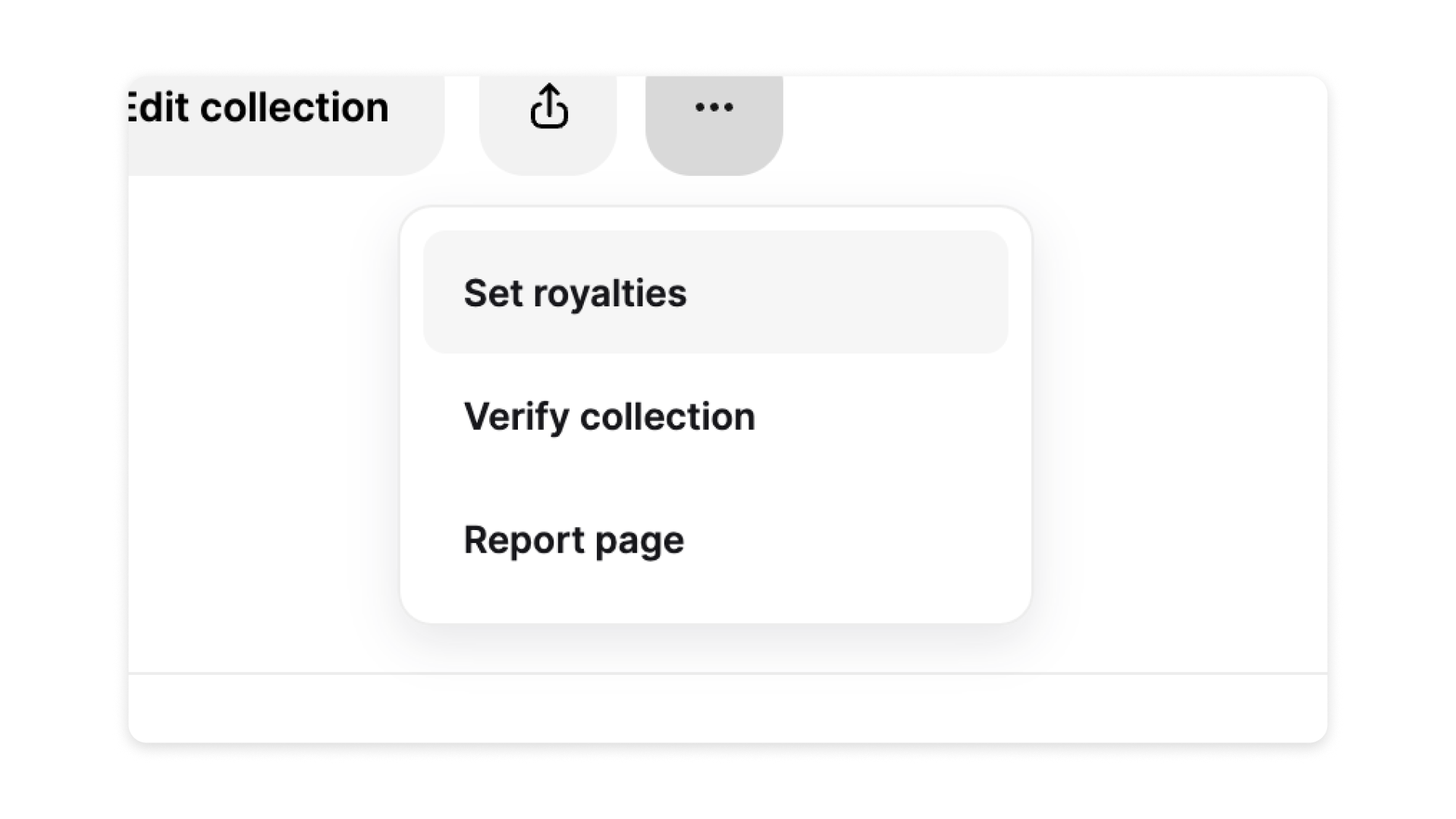 4. Once you’ve verified your ownership of the collection, click the three dots, click “update royalties” and set your royalties to your desired percentage, as well as one or more wallets where they will be sent (keep in mind that adding a lot of wallets might increase the gas fee for buyers).