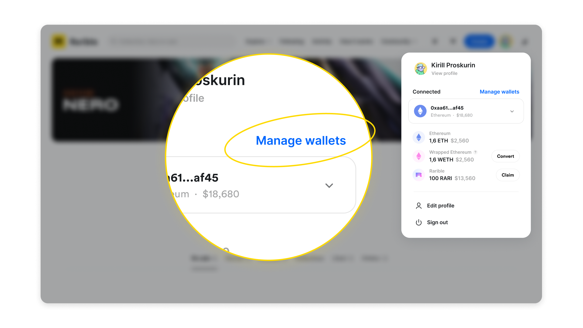 To start, log into your existing Rarible.com profile and click “Manage wallets” in the user menu—or, if you don't have an existing profile, create one first.