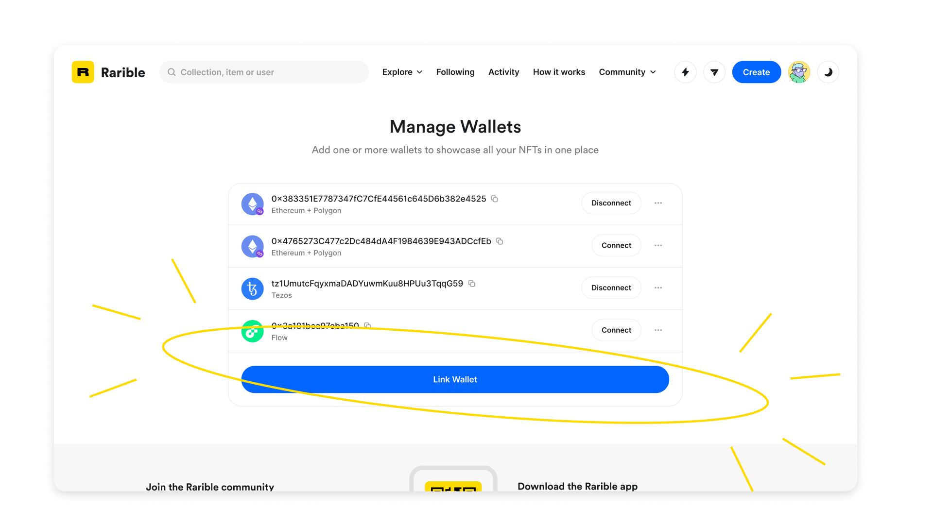 - Start linking wallets, one at a time. It can be wallets from multiple chains, and/or multiple wallets from a single chain depending on your needs. The wallet/blockchain has to be supported by Rarible.com. Also, when merging a wallet, make sure it's not issued by the same provider as the wallet you're currently signed in with. You'll have to add a wallet issued by a different provider before you do that.