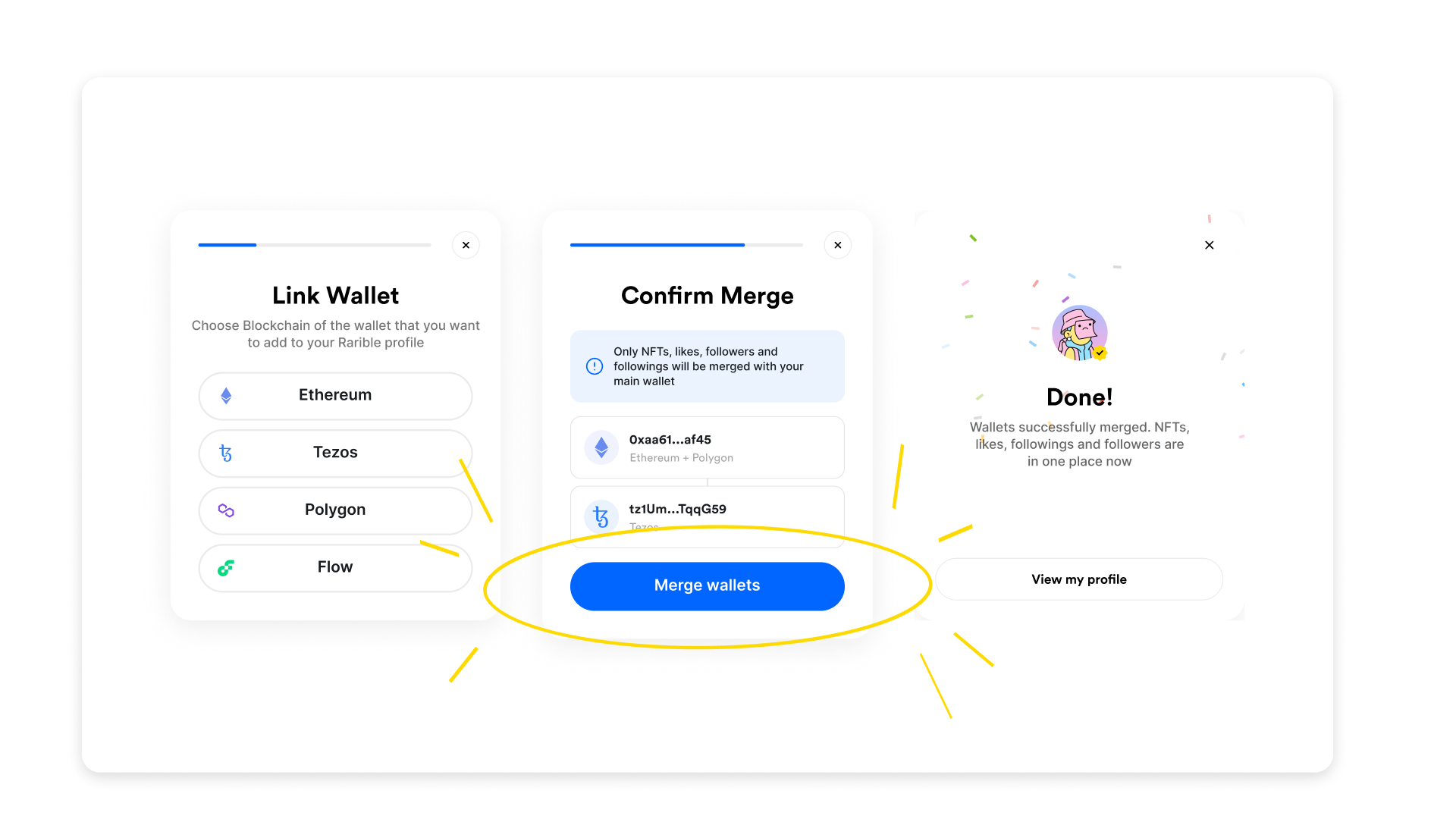 - When you start merging wallets (i.e. adding new wallets to your Multi-wallet account), all your followings, followers, activity and likes will be combined and merged with the main profile. After the merge, some information associated with those wallets on Rarible.com gets wiped. That DOES NOT apply to your NFTs.