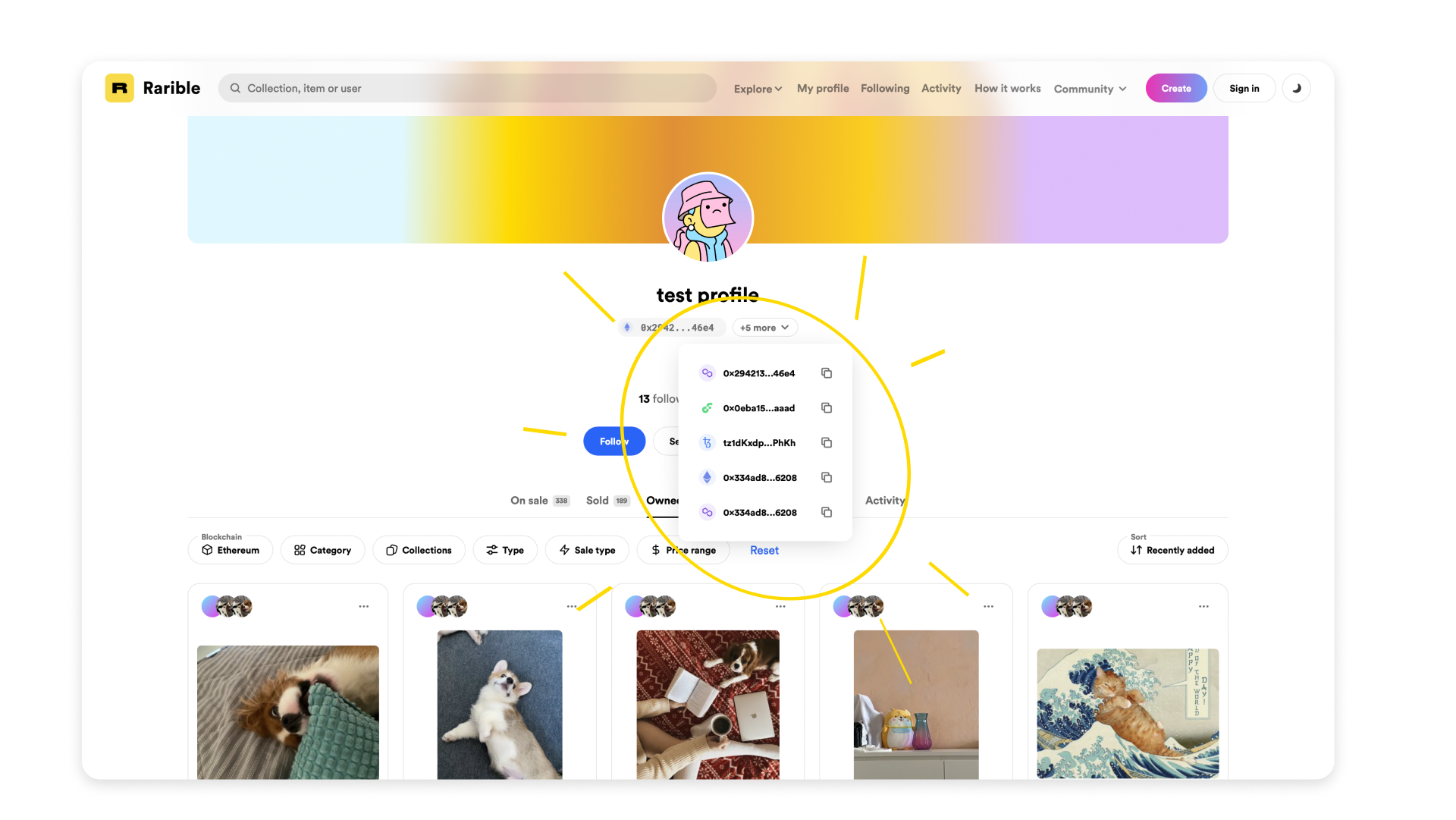 The concept is simple: You can now add wallets from any Rarible-supported blockchain to one Rarible profile where you can see and manage all your NFTs.