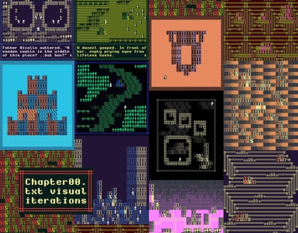 ‘Chapter00.txt’ is his latest collection, which weaves together images and stories, all executed in text-mode art, which is a kind of subgenre of pixel art.