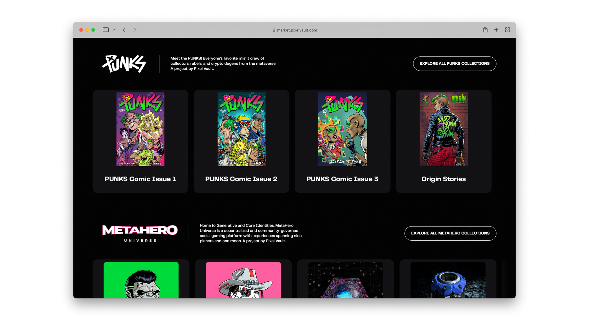 While the PUNKS Comic IP is inspired by CryptoPunks, MetaHero was created by Pixel Vault from the ground up. The goal: Create a gaming ecosystem delivering blockchain-native fun.