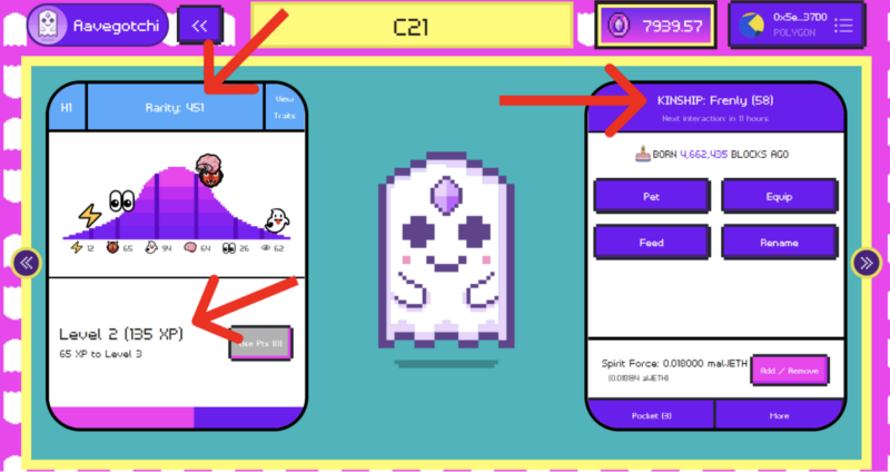 Aavegotchi demand affection from their owners while they are on Polygon. Owners can “pet” their Aavegotchi once every twelve hours, thus increasing their Kinship Score. Luckily for us, Aavegotchis automatically increase Kinship while they are cozy on Rarible and Ethereum mainnet! Still, take note of their Kinship Score because you may want a happy Aavegotchi for gameplay purposes. Note that each Aavegotchi is born with a score of 50 so anything below that score is questionable (but easily fixed with love!).