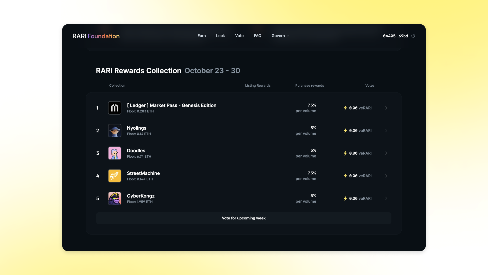 Starting 31 October, the 5 $RARI Rewards Collection are chosen by users who've locked their $RARI to vote. Learn the details here.
