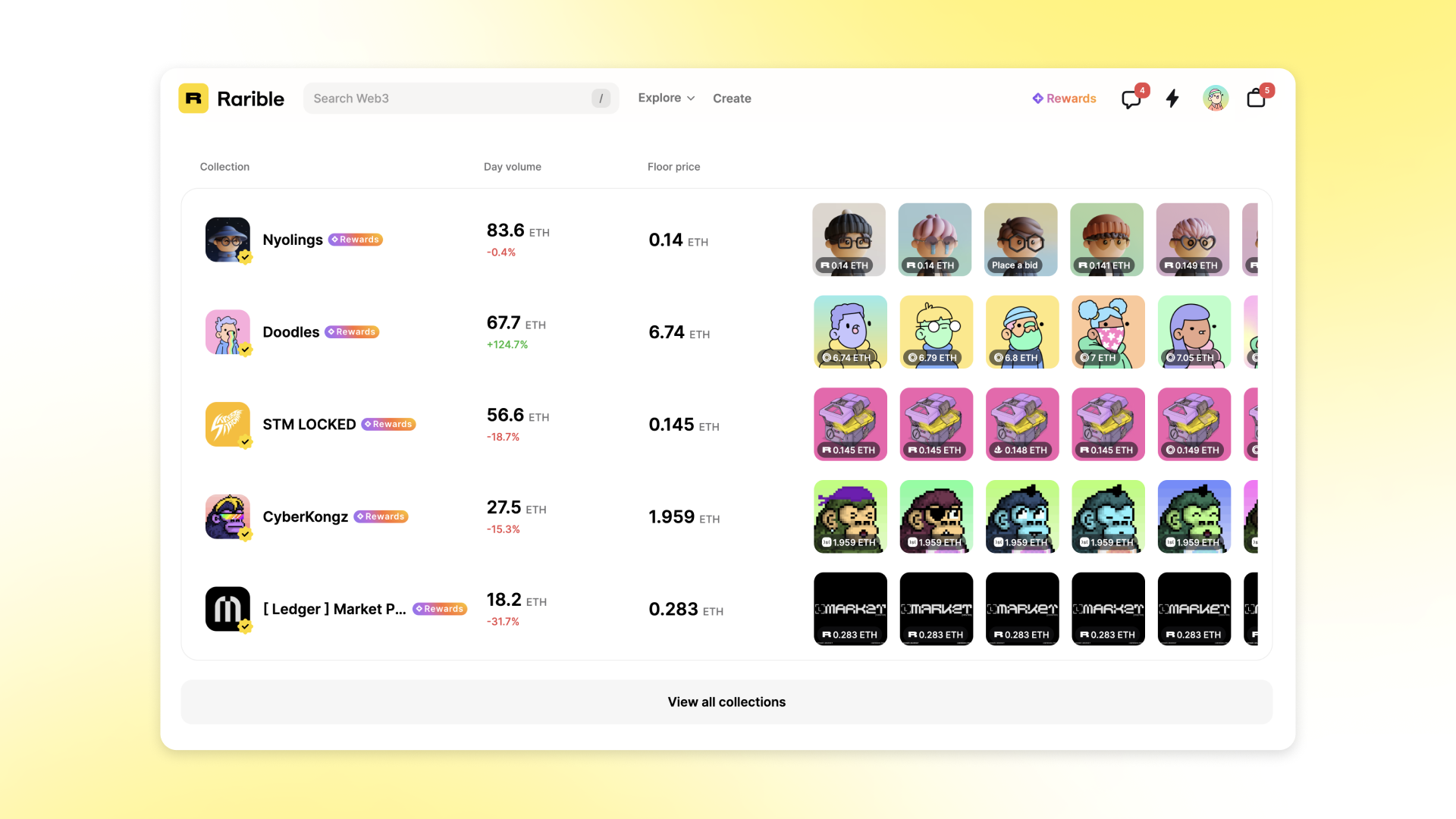 Each week, there are 5 NFT collections for which you can earn rewards. Called $RARI Rewards Collections, these are selected through the voting process.