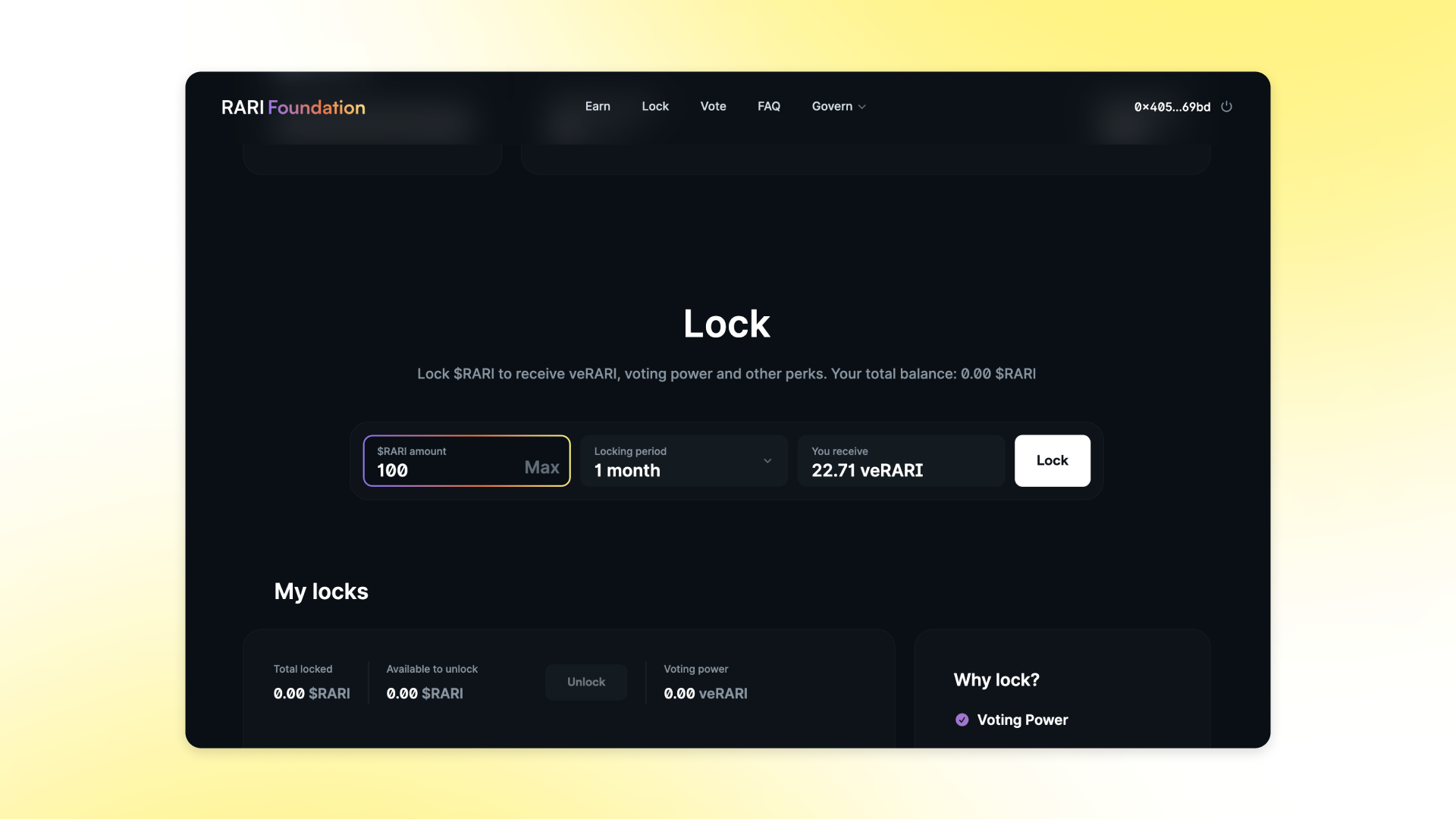 Notably, 100 is a magic number! 100 $RARI is exactly how much you need to lock to get the RARI Prime benefits that include 0% seller fees on Rarible.com, private Discord access, and RARI Prime badge along with veRARI tokens that you can vote with to determine which 5 collections are eligible for rewards each week (you'll receive veRARI tokens even if you lock up any amount of $RARI)