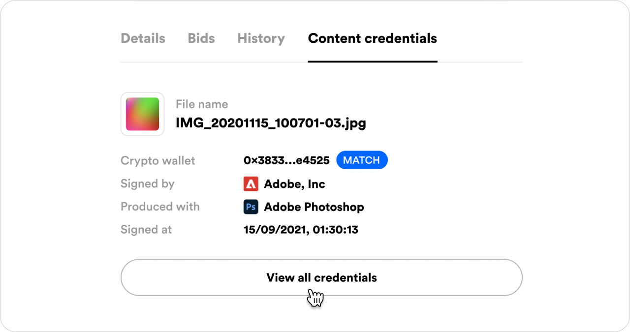 To make sure that the new feature is widely available across the NFT space and collectors can see if the wallet used to create an asset was indeed the same one used to mint, Adobe partnered with Rarible, as well as other key NFT marketplaces, to display Content Credentials.
