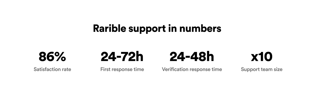 The Rarible Support Team has been working hard over the past few months to optimize response times and streamline the verification process! We’re excited to share that it has resulted in tremendous improvements in service times and customer satisfaction scores. Now you can get your question addressed faster than ever.