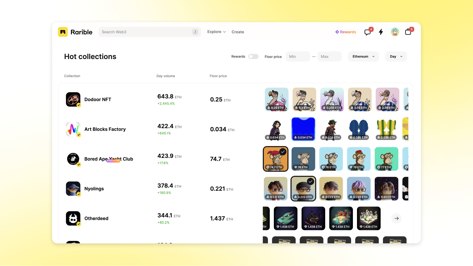 Therefore, because we now aggregate orders from all major marketplaces and charge no extra fees for buying NFTs, it’s now easier than ever to collect any Ethereum NFTs you want at the lowest prices via Rarible.