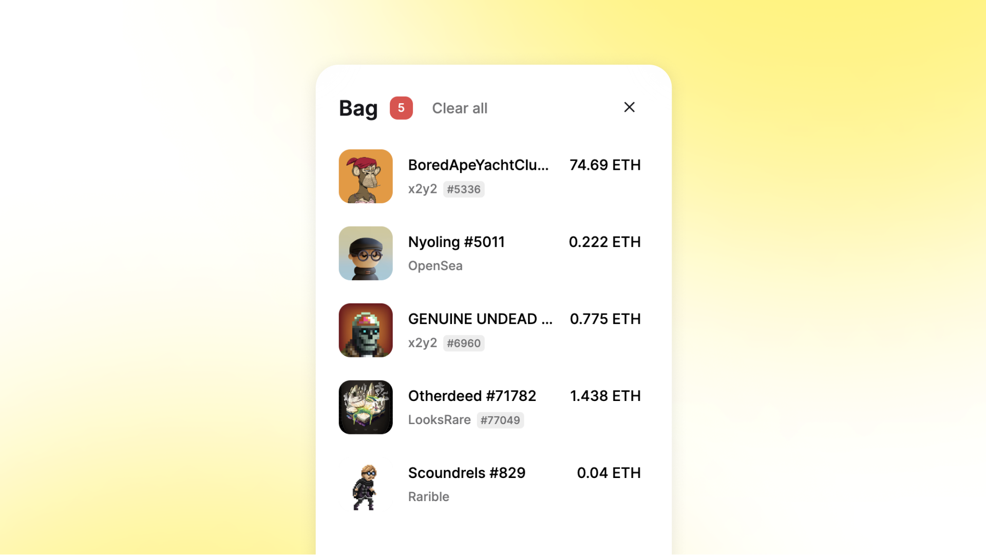 Shortlist the NFTs you want via bag. Multi-buy them in one transaction.
