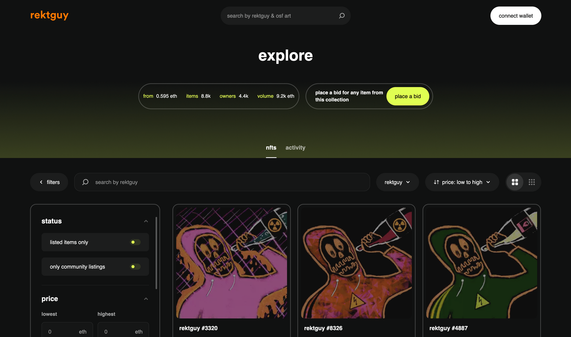 That’s why we love the rektguy NFTs. It’s fun to read their confessions on Twitter, it’s cc0, the art is good—and the project serves an important purpose in the community (we'll get into that shortly). So we worked with OSF—the project's co-founder—to ship a zero-fee community marketplace for the rektguy community.