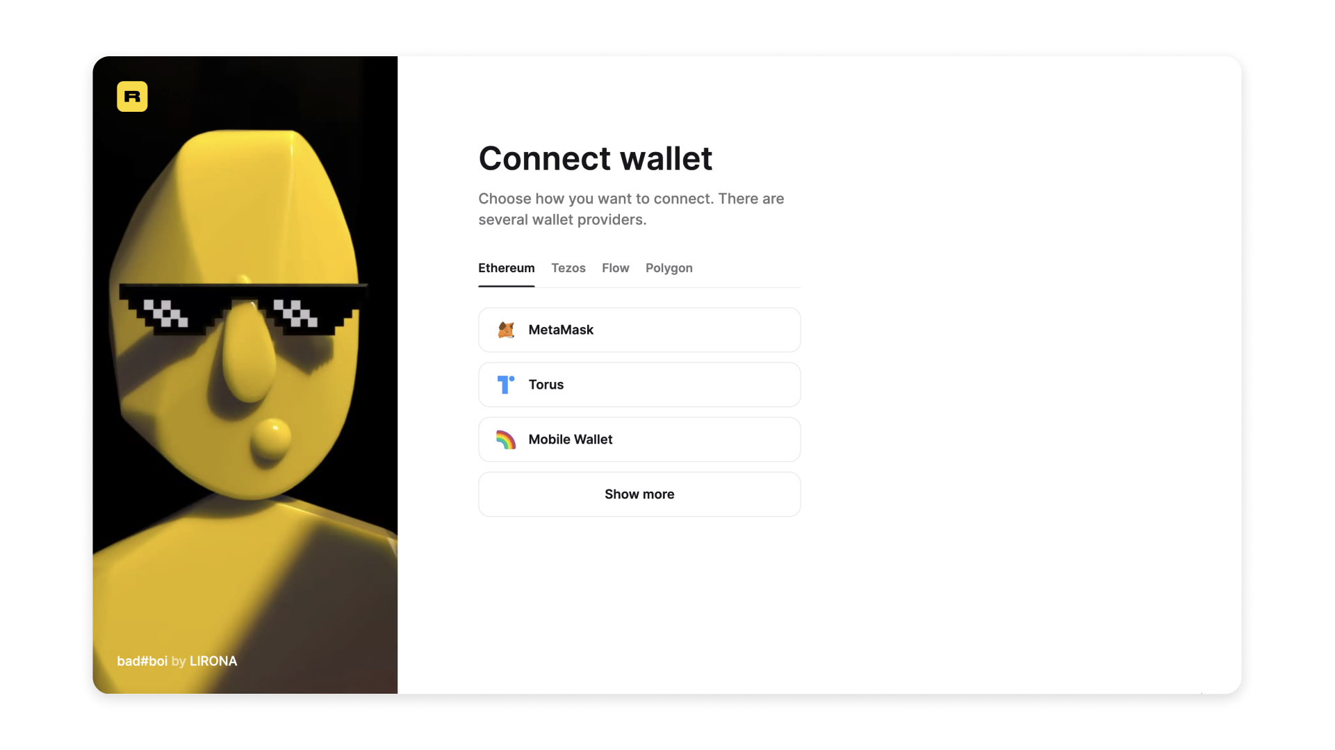 Some of the wallet connect options on Rarible include MetaMask, Rainbow, Coinbase, Temple, Blocto, Portis, Trust and others.