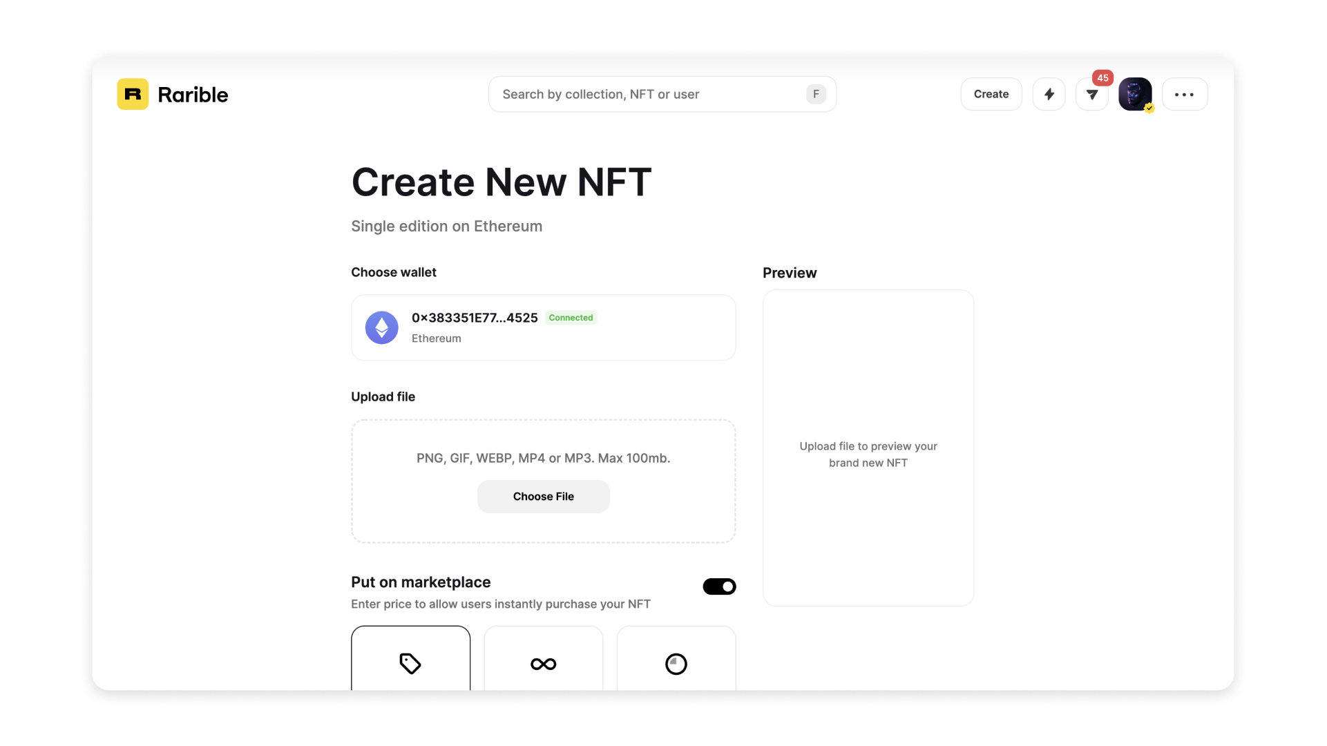 You can also create your own collection. That makes it easier for your community to find your work and buy it. But creating your own collection also costs additional gas fees once. We generally recommend minting under the Rarible collection first and starting your own collection once you’ve sold a few NFTs.
